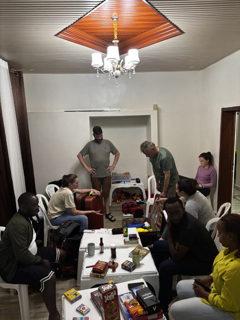 Once we arrived at our accommodations, we unloaded our baggage and began separating tools and PPE from our personal items. That evening, the Bridges to Prosperity cook treated us to a delicious dinner of rice, spinach, potatoes, and goat—our first meal in Butare.